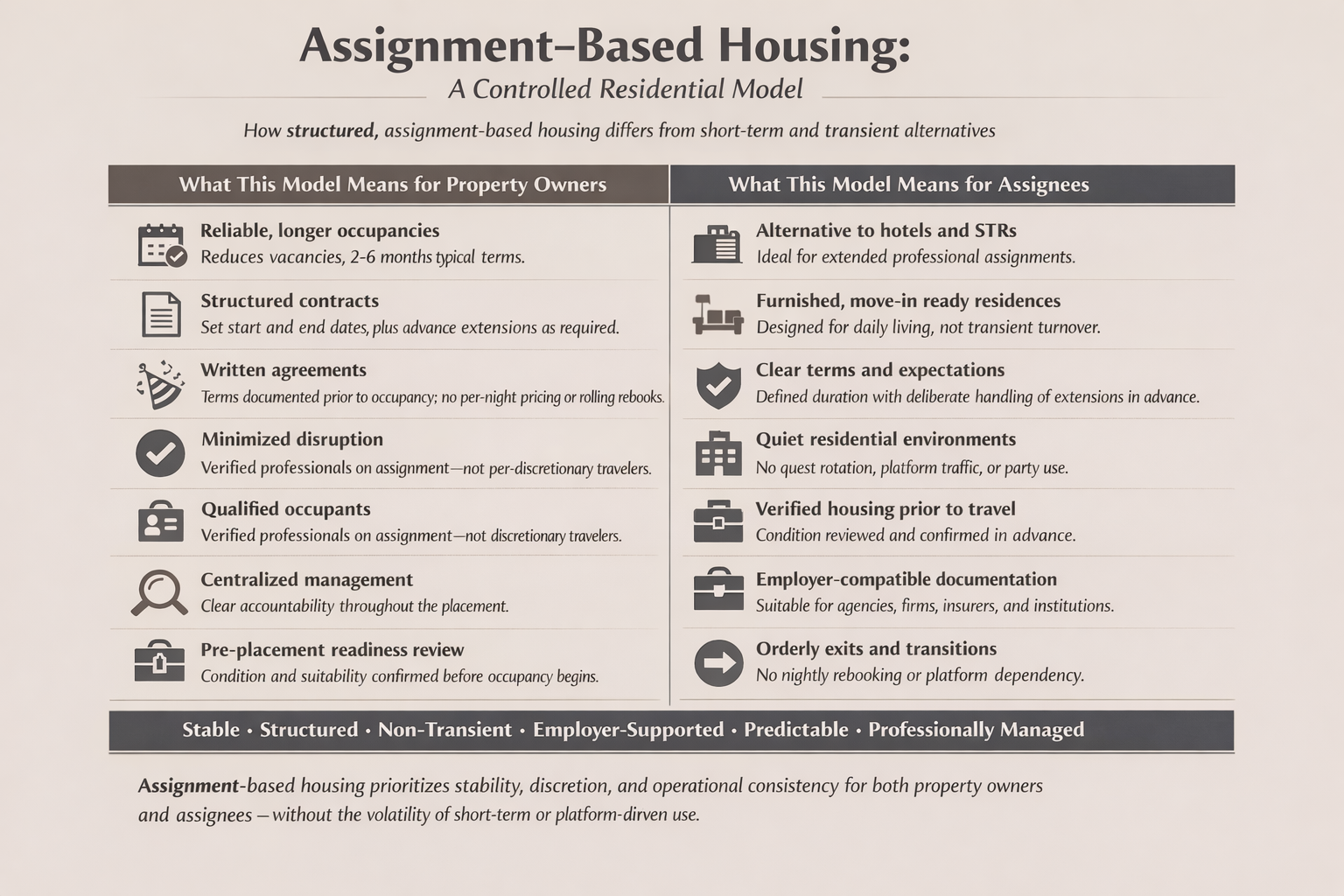 For property owners, assignment-based housing offers extended occupancy under clear parameters that reduce churn and protect the asset. For occupants—such as government personnel, healthcare professionals, attorneys, consultants, and corporate assignees—it provides quiet, work-ready housing supported by formal documentation, consistent management, and orderly transitions at assignment conclusion.