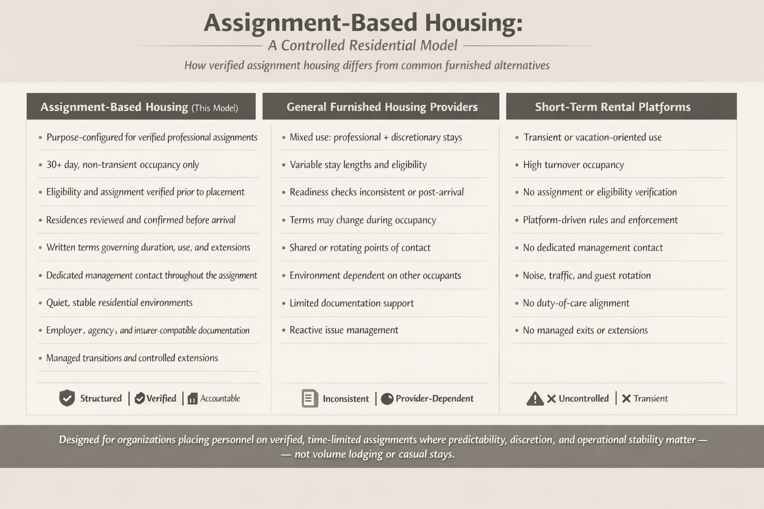 This housing model is designed to reduce operational risk and maintain consistency for professional placements. Residences are managed for discretion and privacy, without overbooking, unit substitutions, or vacation-style use. Occupancy standards are applied uniformly, readiness is verified prior to arrival, and management continuity is maintained throughout the assignment, resulting in predictable, low-disruption housing.